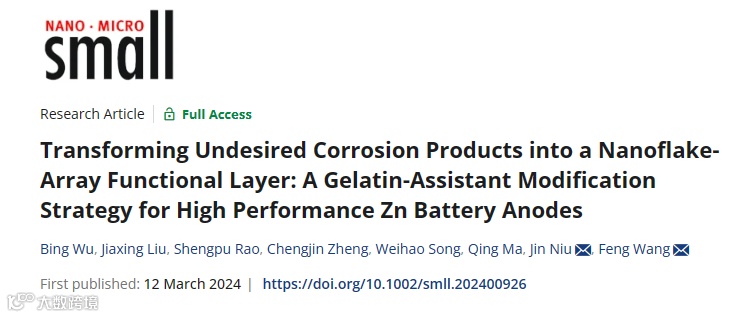 近日,北京化工大学王峰教授、牛津副教授团队在国际知名期刊Small 上发表题为“Transforming Undesired Corrosion Products into a Nanoflake-Array Functional layer: A Gelatin-Assistant Modification Strategy for High Performance Zn Battery Anodes”的研究工作。该工作通过简单可控的腐蚀热解过程,以明胶作为辅助剂,将腐蚀产物转变成均一的纳米片阵列,作为锌金属负极表面功能层。作者详细揭示了功能层对锌负极的改性机理,改性后的锌负极在半电池和全电池中均表现出优异的性能,展示了该策略良好的应用前景。