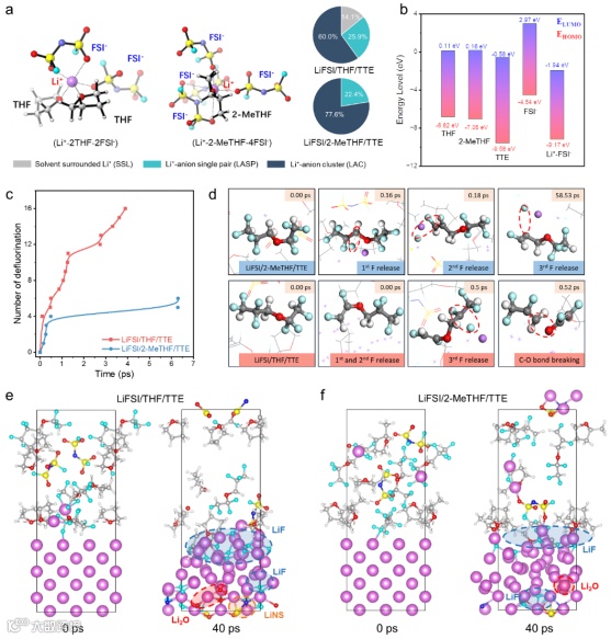 图4. a)THF与2-MeTHF基电解液中溶剂化结构的分子动力学模拟(MD)结果。b)电解液组分的LUMO-HOMO能级。c)HAIR-MD模拟中观察到的界面脱氟反应次数。 d)两种电解液中TTE分子的脱氟反应详细机制。e)THF基电解液以及f)2-MeTHF基电解液与锂金属之间界面反应快照。