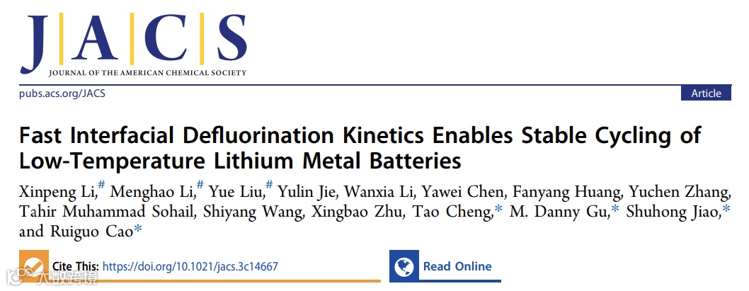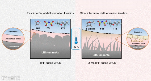 近日,中国科学技术大学曹瑞国教授和焦淑红教授课题组联合苏州大学程涛教授团队,在国际知名期刊J. Am. Chem. Soc.上发表题为“Fast Interfacial Defluorination Kinetics Enables Stable Cycling of Low-Temperature Lithium Metal Batteries”的文章。该文章通过使用四氢呋喃(THF)和2-甲基四氢呋喃(2-MeTHF)作为对比溶剂,揭示了局部超浓电解液的快速界面脱氟动力学在调控锂金属生长和锂金属负极稳定性方面的关键作用,实现了-30 ℃低温下无枝晶的锂沉积形貌以及约99.63%的锂沉积/剥离库仑效率。