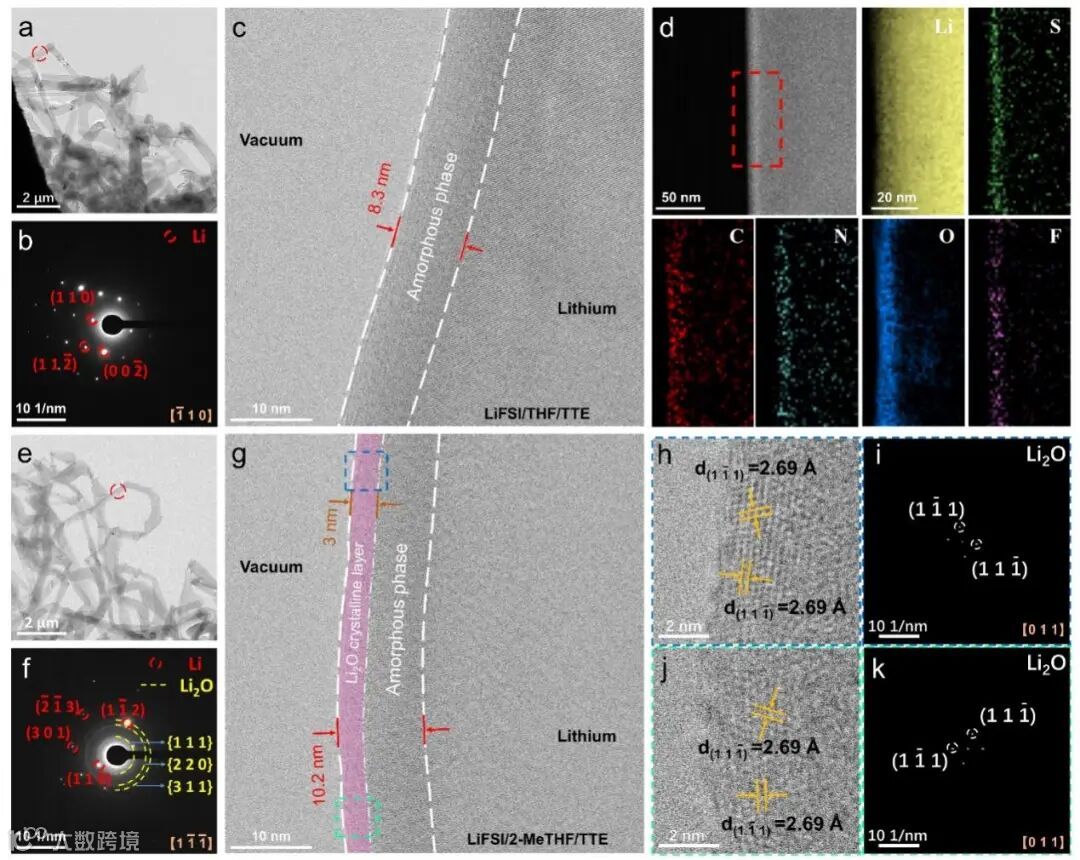 图3. THF和2-MeTHF基电解液中a, e)锂沉积的低倍Cryo-TEM图像,b, f)选区电子衍射图以及c, g)形成的SEI的高倍Cryo-TEM图像。d)THF基电解液中形成的SEI的冷冻EELS元素分布图像。h-k)2-MeTHF基电解液中所形成SEI的局部区域高分辨TEM和FFT图像。