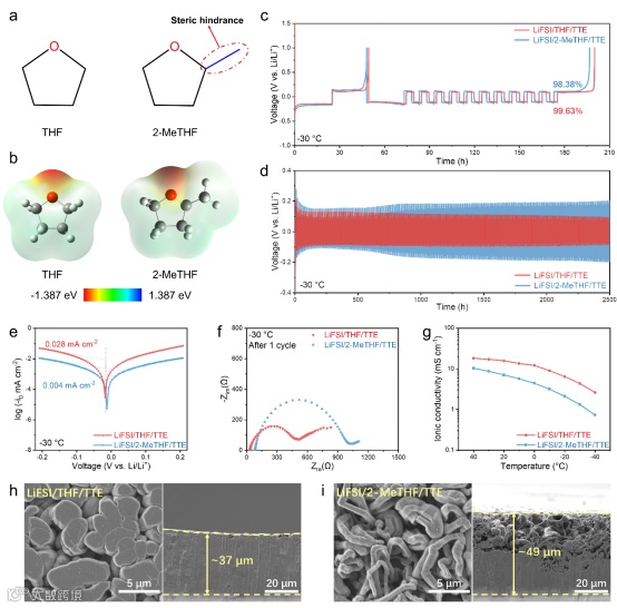 图2. THF和2-MeTHF溶剂的a)分子示意图和b)分子静等势能面。THF和2-MeTHF基电解液中c)Li||Cu半电池和d)Li||Li对称电池的循环性能。-30 ℃低温条件下,THF和2-MeTHF基电解液中e)Li||Cu电池CV结果中提取的交换电流密度,f)Li||Li对称电池界面阻抗以及g)电解液离子导电率。h)THF基和i)2-MeTHF基电解液在-30 ℃低温下的锂金属沉积形貌。