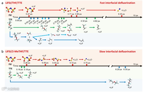 图5. a)THF基与b)2-MeTHF基电解液在锂金属负极表面发生分解反应的HAIR-MD模拟快照。