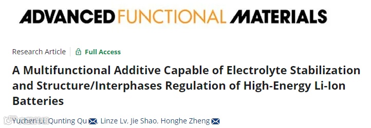 近日,来自苏州大学的曲群婷教授和郑洪河教授合作,在国际知名期刊Advanced Functional Materials上发表题为“A Multifunctional Additive Capable of Electrolyte Stabilization and Structure/Interphases Regulation of High-Energy Li-ion Batteries”的观点文章。该文章介绍了一种多功能添加剂,它能够消除HF、抑制电解质分解,并且在高镍正极和石墨负极构建优异的相间层以及稳定正极的晶体结构。这种添加剂普遍适用于以高镍正极为基础的锂离子电池,并能大大提高其电化学性能。