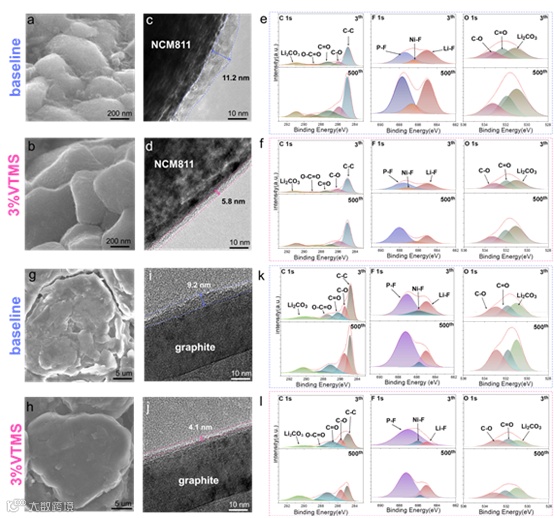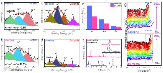 由于VTMS具有消除HF的作用,因此可以防止高频侵蚀导致正极中的过渡金属离子溶解,从而稳定正极结构的稳定性。通过XPS测试可以发现正极的锂镍混排现象在添加了VTMS后得到了抑制。同时,石墨负极也检测到了更少的Ni峰,这说明过渡金属的沉积也减少了。