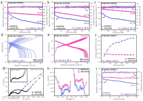我们使用了NCM811、NCM622、NCM523正极和石墨负极组装了全电池。对这些电池的充放电行为进行了系统研究。我们发现不论是在常温、高低温、以及高压等不同的测试条件下,使用了VTMS添加剂的电化学循环性能均有着明显的提升。同时我们发现,使用了3%VTMS的全电池电池极化现象、电池阻抗得到了明显减少,这应该也归功于该添加剂对于电池的多重作用。