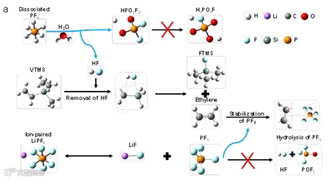 图2. LiPF6 的反应和 VTMS 添加剂的工作机制示意图