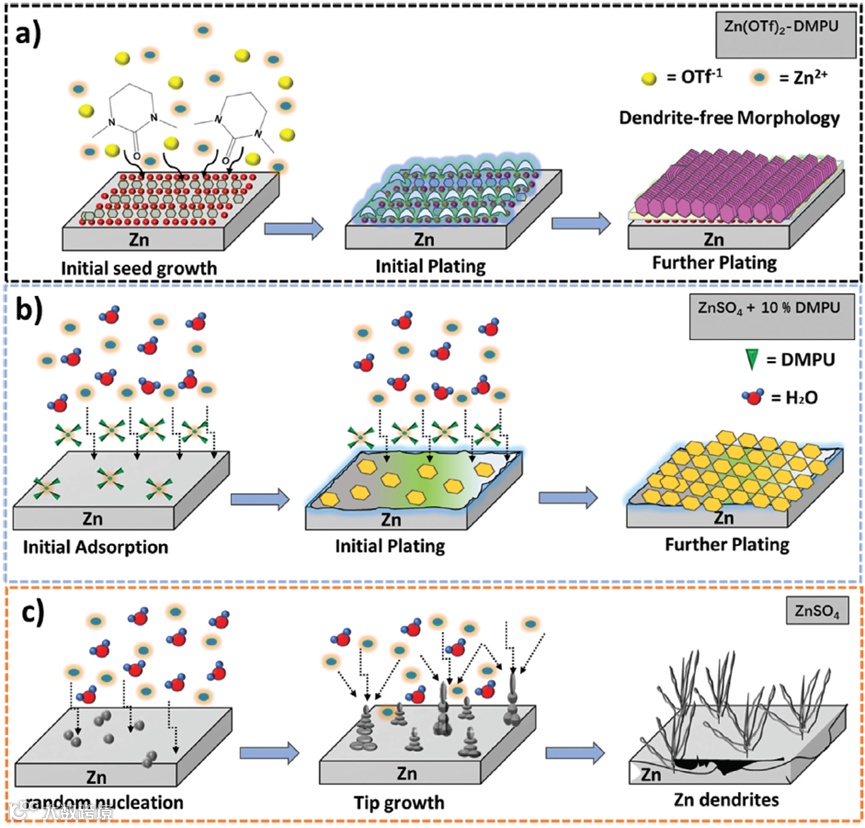 图2. a) DMPU、 b) ZnSO4 + DMPU、 c) ZnSO4电解质中不同镀锌相示意图。