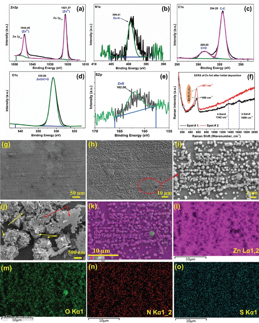 图1. 锌负极的表面表征。a-e) 锌负极在DMPU电解液中初始沉积后的XPS分析;f) 锌负极初始沉积后的SERS光谱;g-o) SEM图像及相应的EDS元素映射图。