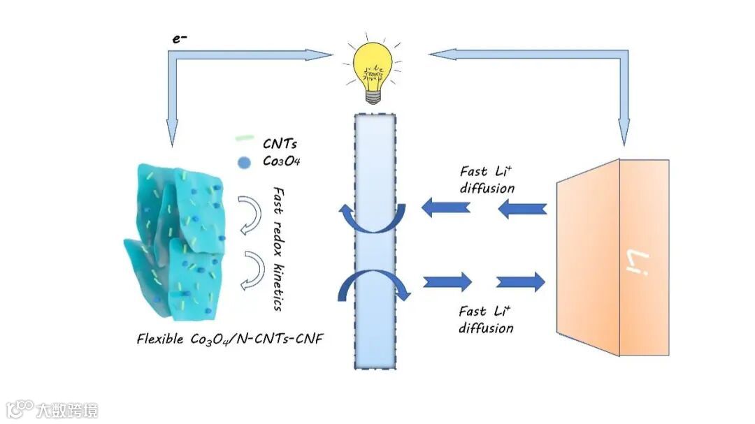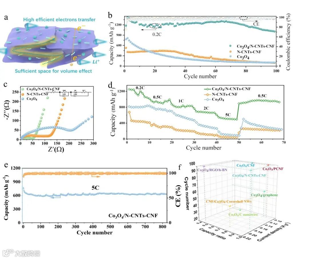 柔性自支撑Co3O4/N-CNTs-CNF结构在无集流剂和导电剂粘合剂的情况下,在0.2C电流密度下具有1176 mAh g-1的高初始放电容量,提高了倍率性能(5C时545 mAh g-1),并具有良好的长期循环稳定性(5C倍率下824次循环仍能保持 82.5% 的容量)。