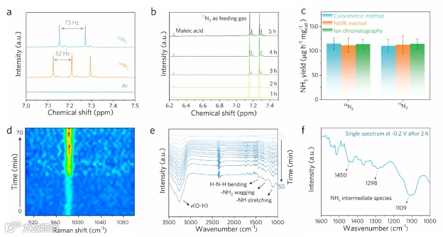 通过包含同位素测试在内的不同检测方法定量了FeN2B2-C的电化学合成氨产物。引入原位拉曼及原位红外光谱法来检测电化学固氮过程中的反应产物及反应中间体。在FeN2B2-C阴极表面,NH3及*N2Hy中间体的出现为氮还原的发生提供了分子水平的证据。