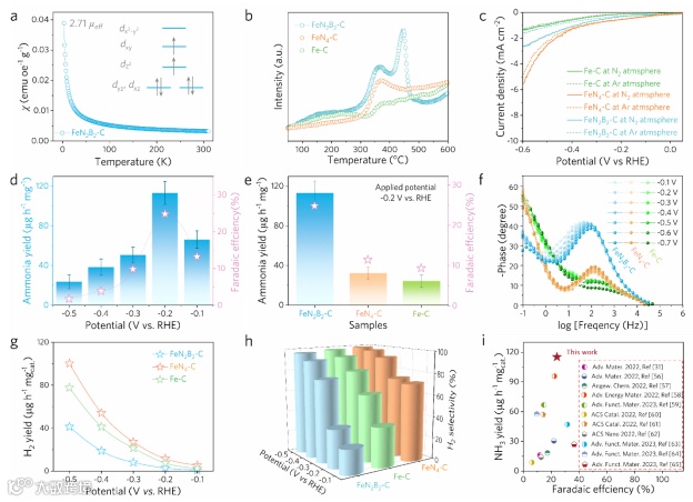 Figure 4. Electrochemical performance of FeN2B2-C. (a) Magnetic susceptibility of FeN2B2-C. (b) N2-TPD patterns of FeN2B2-C, FeN4-C, and Fe-C, respectively. (c) Linear sweep voltammetry curves in N2 and Ar-saturated neutral solutions. (d) Ammonia yield rate and Faradaic efficiency at the corresponding potentials. (e) Electrochemical nitrogen fixation performance at -0.2 V vs. RHE, (f) Bode phase plots of the in-situ EIS, (g) H2 yields, and (h) H2 selectivity of FeN2B2-C, FeN4-C, and Fe-C, respectively. (i) The comparison of the electrochemical nitrogen fixation performance of FeN2B2-C and reported representative work.