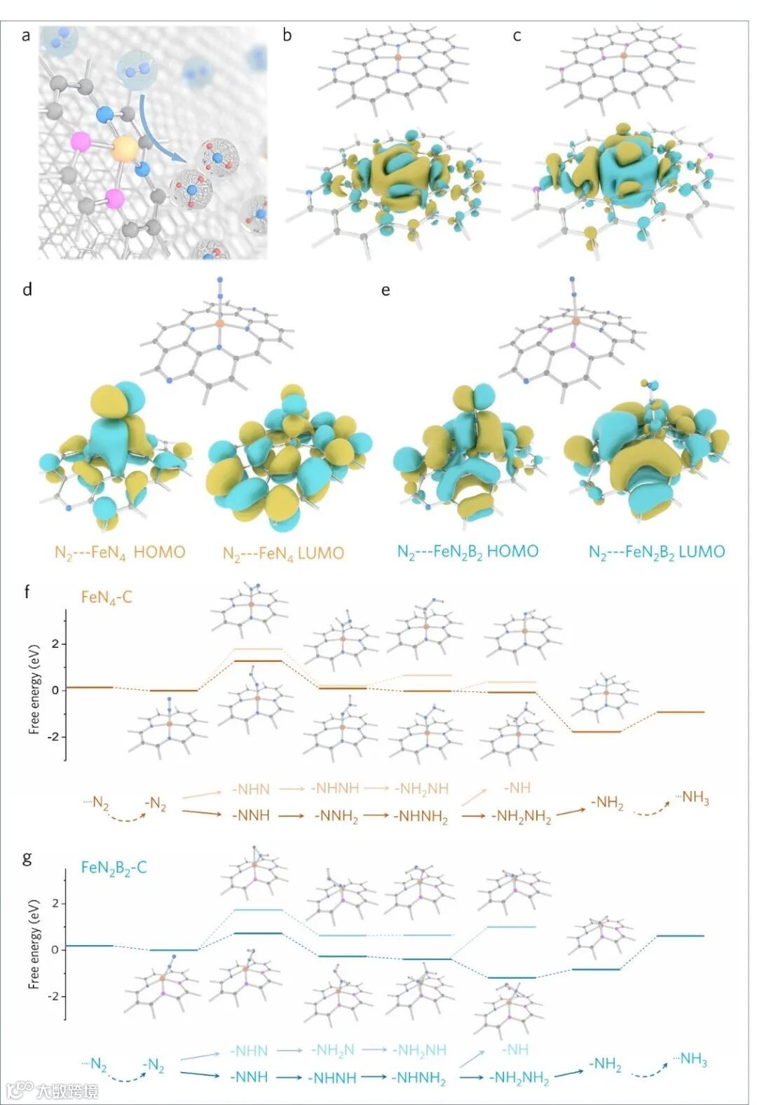 Figure 1. Theoretical studies of electronic perturbation. (a) Scheme of the electronic perturbation of isolated Fe coordination sphere for nitrogen fixation. (b) The structure and charge density differences of FeN4-C structures and (c) FeN2B2-C structure. (d) The structure and HOMO/LUMO charge density distributions of FeN4-C with adsorbed nitrogen and (e)FeN2B2-C structures with adsorbed nitrogen. (f) Calculated free energy diagram of the nitrogen reduction reaction mechanism on FeN4-C and (g) FeN2B2-C.