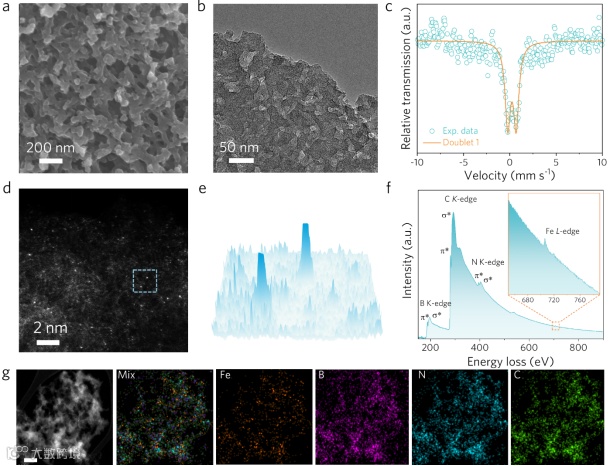 Figure 2. Physicochemical properties of FeN2B2-C. (a) SEM image, (b) TEM image, (c) room-temperature 57Fe Mössbauer spectrum, (d) high-resolution AC-HAADF-STEM image, (e) pseudocolor surface plot of the selected area, (f) EELS spectra and (g) EDX mapping images of FeN2B2-C. The scale bar of Figure 2g is 50 nm.