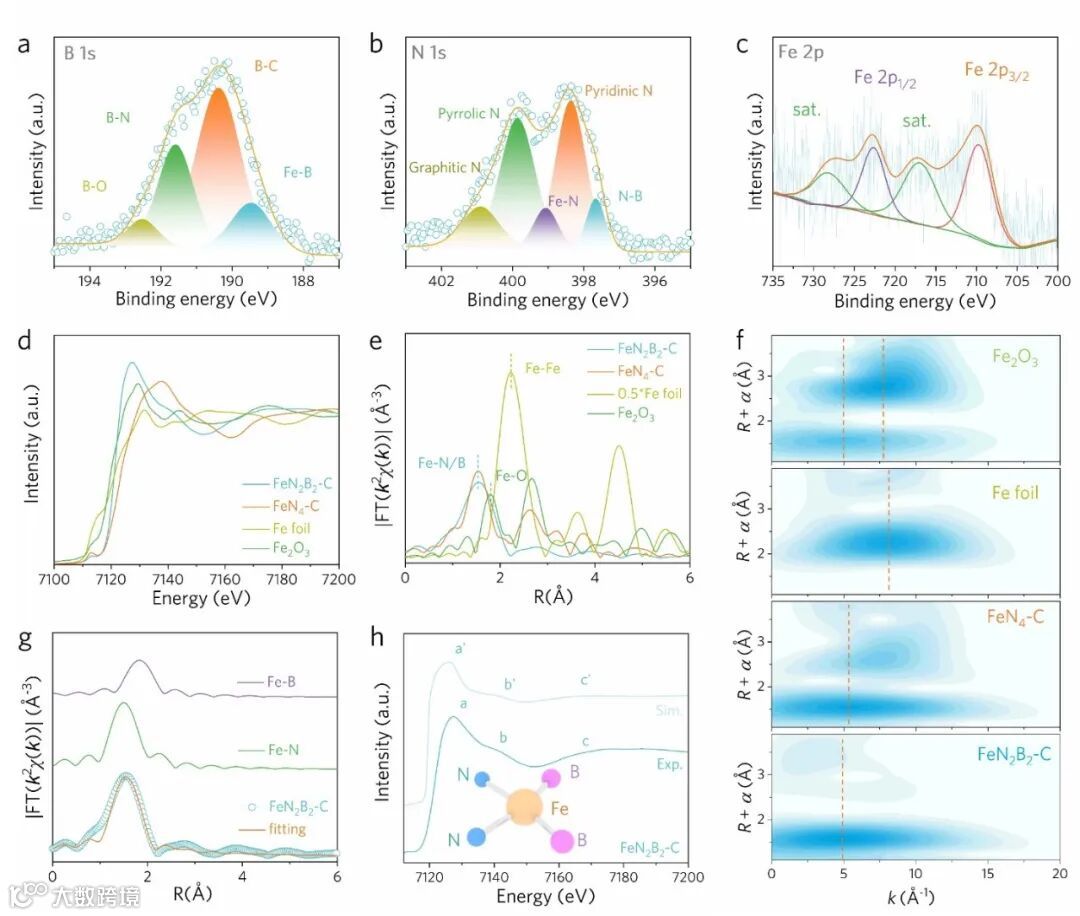 Figure 3. Chemical structures of FeN2B2-C. (a) High-resolution XPS spectra of B1s, (b) N1s and (c) Fe 2p. (d) Fe K-edge XANES spectra. (e) k2-weighted FT-EXAFS curves at the Fe K-edge. (f) WT contour plots of the EXAFS signal for FeN2B2-C, FeN4-C, Fe2O3, and Fe foil reference samples, respectively. (g) FT-EXAFS fitting curves in R space of FeN2B2-C. (h) The Fe K-edge XANES experimental spectrum of FeN2B2-C and the corresponding theoretical spectrum calculated with the depicted structure.