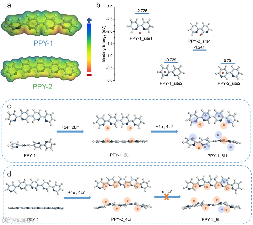 图2. (a)PPY-1和PPY-2的ESP分布(b)Li离子在PPY-1和PPY-2中不同位点的结合能(c)预测的PPY-1的锂化过程(d)预测的PPY-2的锂化过程
