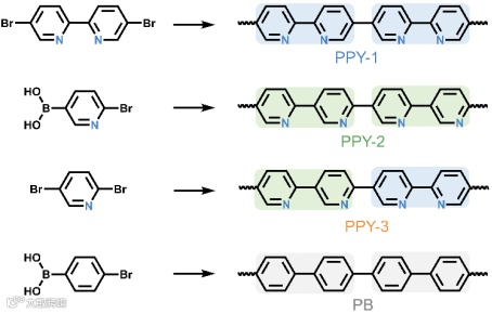 图1. 三种吡啶基导电聚合物结构异构体(PPY-1,PPY-2和PPY-3)的合成路线及化学结构