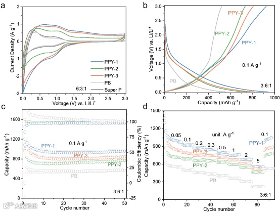 为了研究吡啶基导电聚合物在电池中的应用可能,并证实上述电荷存储机制,以锂为对电极,以Super P为导电添加剂,羧甲基纤维素钠为粘结剂制备了PPY-1、PPY-2和PPY-3的半电池。在循环伏安测试中,与PPY-2和PPY-3相比,在相同的电流密度下PPY-1具有最大的积分面积,暗示了最多的Li离子存储,而PPY-2具有最小的积分面积,代表最少的Li离子存储。而不具有C=N双键的聚苯(PB)则具有与Super P几乎完全相同的CV曲线,表明由于C=N双键的缺少,不具备额外的Li离子存储能力。此外,与PPY-2相比,具有螯合C=N双键的PPY-1和PPY-3在1.5/1.7 V处可观察到额外的一对氧化还原峰,该峰应该归因与螯合的C=N双键的锂化过程。为排除电导率的影响,在60 wt.%导电添加剂存在下对三种导电聚合物进行了恒流充放电测试,在0.1 A g-1的电流密度下,PPY-1,PPY-2和PPY-3所展现出的放电容量符合PPY-1>PPY-3和PPY-2的顺序,经过50次循环后,在扣除导电添加剂的贡献时,分别具有456.8, 268.5 and 341.3 mAh g-1的放电比容量。值得注意的是在多种不同的电流密度下,三种导电聚合物所展现出的放电比容量均满足这一顺序。