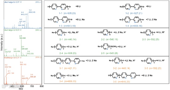图4. 三种吡啶基导电聚合物在放电至0.01 V后的MALDI-TOF光谱。