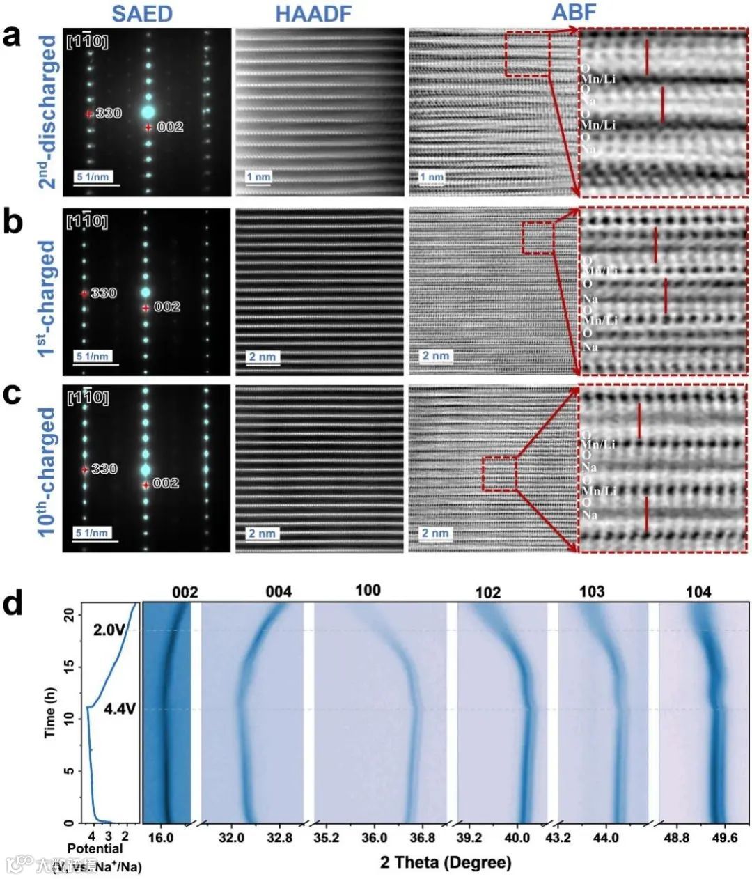 图2. 第2周放电到1.5 V时(a), 第1周充电到4.5 V时(b), 第10周充电到4.5 V时(c)的Sample Q的SAED花样,STEM-HAADF,STEM-ABF和ABF像局部放大图;在1.5-4.4 V时Sample Q的原位XRD结果(d)。