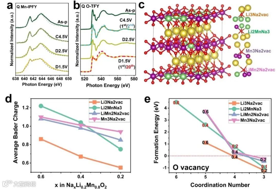 反位结构提供了丰富的O/Mn构型。通过同步辐射X射线吸收谱(XAS)发现:Sample Q充电中的O氧化和放电中的Mn还原增多(图3a和b)。结合第一性原理计算,发现相比于带状有序的Sample P,Sample Q中具有两种额外的O构型(O-Li2和O-Li3)。其中,O-Li2不仅可以激活更多的O氧化(Bader电荷计算结果,图3d),还可以保持结构稳定(O空位形成能计算结果,图3e)。