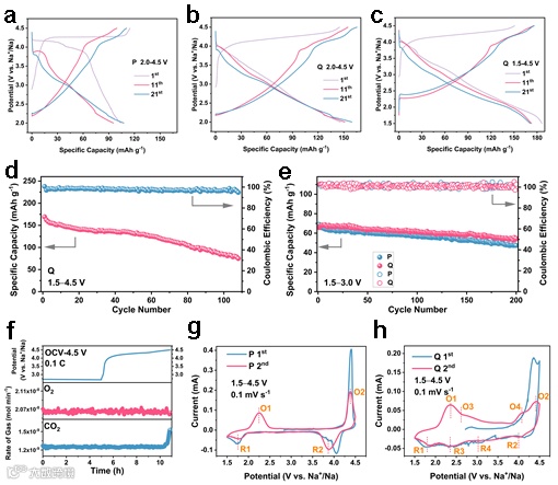 图4. 在2.0-4.5 V时Sample P(a)和Sample Q(b)的第1,11,21周充放电曲线;在1.5-4.5 V时Sample Q的第1,11,21周充放电曲线(c);在1.5-4.5 V时Sample Q的大电流循环性能(d);在1.5-3.0 V时 Sample P和Sample Q的循环性能(e);在OCV-4.5 V时Sample Q的DEMS结果;在1.5-4.5 V时Sample P(g)和Sample Q(h)的第1,2周的CV曲线。