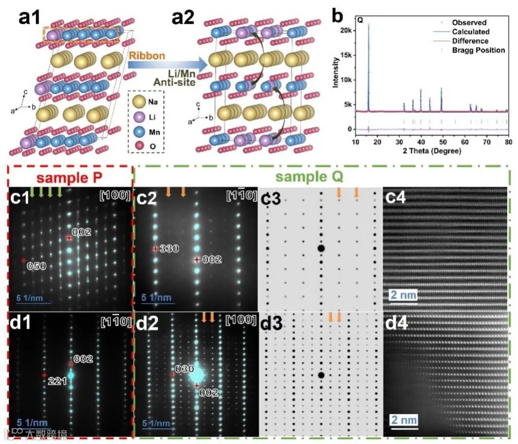 图1. Sample P(a1)和Sample Q(a2)的结构示意图;Sample Q的XRD图谱(b);Sample P 的选区电子衍射花样(c1, d1);Sample Q对应带轴的选区电子衍射花样(c2, d2),模拟的电子衍射花样(c3, d3),对应的高角度环形暗场像(c4, d4)。