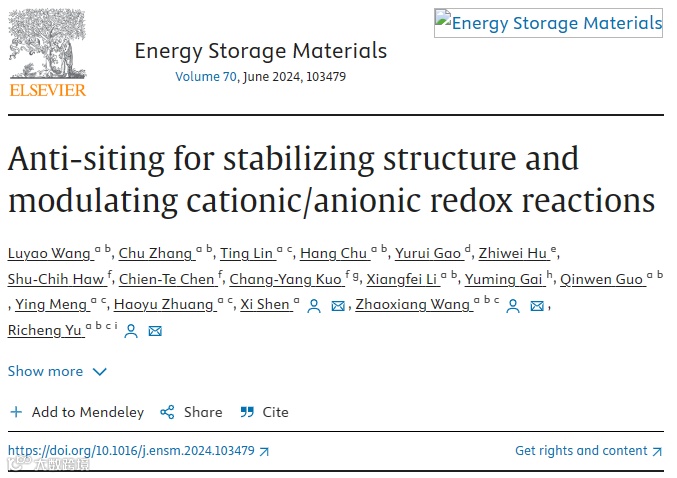 Luyao Wang, Chu Zhang, Ting Lin, Hang Chu, Yurui Gao, Zhiwei Hu, Shu-Chih Haw, Chien-Te Chen, Chang-Yang Kuo, Xiangfei Li, Yuming Gai, Qinwen Guo, Ying Meng, Haoyu Zhuang, Xi Shen, Zhaoxiang Wang, Richeng Yu, Anti-siting for Stabilizing Structure and Modulating Cationic/Anionic Redox Reactions, Energy Storage Materials, 2024, 103479, ISSN 2405-8297