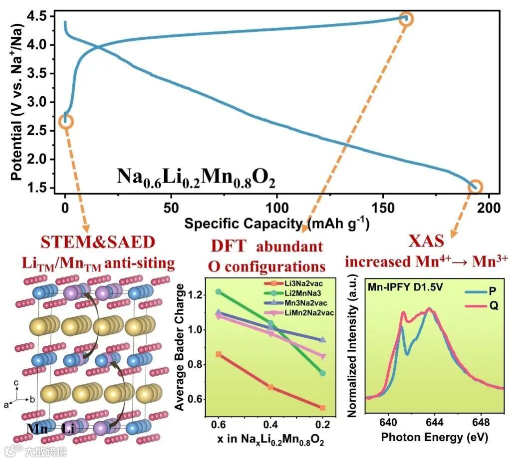 在钠离子电池正极材料中,具有阴离子氧化还原活性的富Mn层状氧化物因具有高容量而倍受关注。然而,较低的Mn氧化还原电位和不可逆相变等因素制约其发展。合理的过渡金属(TM)层设计可以调控阴/阳离子的氧化还原,并有望解决上述问题。本文将Li/Mn反位结构引入P2-Na0.6Li0.2Mn0.8O2材料中,构筑的多种O/Mn构型激活了不同的O/Mn氧化还原过程。同时,这种“自锁”的反位结构抑制了不利的相变,使得材料的可逆容量由104.2 mAh g−1提高到153.7 mAh g−1。