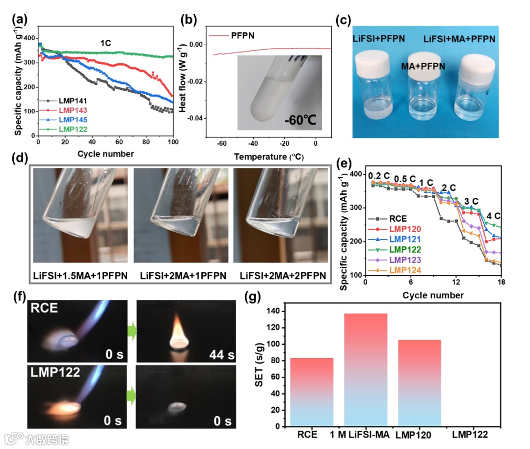 图1. 不同电解液配方的电化学性能与阻燃性测试结果
