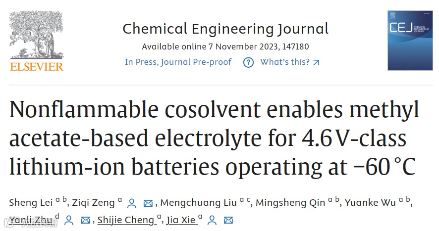 近日,华中科技大学的谢佳教授和曾子琪博士,在国际知名期刊Chemical Engineering Journal上发表题为“Nonflammable Cosolvent Enables Methyl Acetate-based Electrolyte for 4.6 V-class Lithium-ion Batteries Operating at −60 °C”的研究文章。