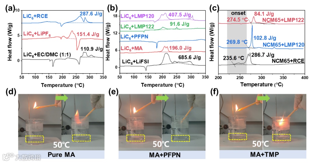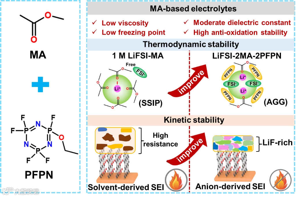 锂离子电池(LIBs)被广泛应用于电动汽车和大规模储能系统中,在追求碳中和目标中发挥着重要作用。随着LIBs的应用不断扩大,特别是在深海探索、极地研究和航空航天等领域,对其在低温环境下的性能提出了越来越高的要求。同时,为了追求更高的能量密度以扩大电动车的续航里程和减小设备尺寸,增加LIBs的工作电压变得至关重要。然而,传统EC基碳酸酯电解液工作温度范围狭窄,电压窗口有限,且易燃。无法满足这些要求。因此,有必要开发先进的无EC电解液,使LIBs能够在高电压和低温下运行。为了解决这一问题,乙酸甲酯(MA)被考虑作为一种潜在的电解液溶剂。然而,MA基电解液对石墨负极具有较差的兼容性和高易燃性,这会影响电池的循环寿命并带来安全风险。很多研究者通过优化它们的热力学或动力学稳定性来增强MA基电解液的界面稳定性。但是,这些报道的电解液仍然存在易燃的问题。阻燃剂的应用已被证明是一个解决方案。然而,由于MA溶剂的低沸点和高蒸汽压,传统的低蒸汽压阻燃剂可能无法有效解决这个问题。此外,阻燃剂与锂离子的相互作用也可能影响电池的性能。因此,开发兼具不燃、高压和的低温电解液,仍存在困难。