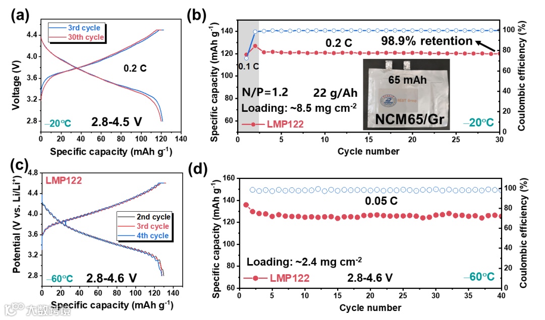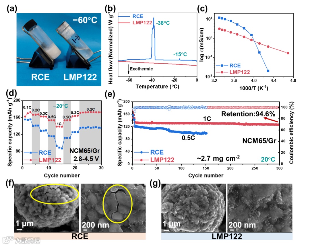 LMP122电解液在-60℃下不凝固,并且具有高的电导率(0.17 mS cm−1)。-20℃和4.5V测试条件下,采用LMP122的NCM65/Gr电池在0.1C和1C下的容量分别为172.6和138.5 mAh/g。此外,在1C下循环300圈后可保持94.6%的初始容量。循环后极片的一系列表征表明电极结构保持良好,形成了良好的CEI。
