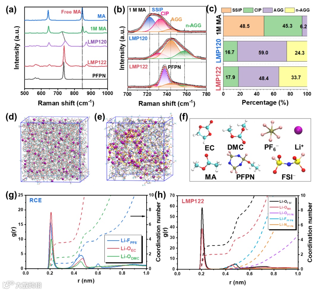 图3. 电解液的Raman测试与分子动力学模拟结果