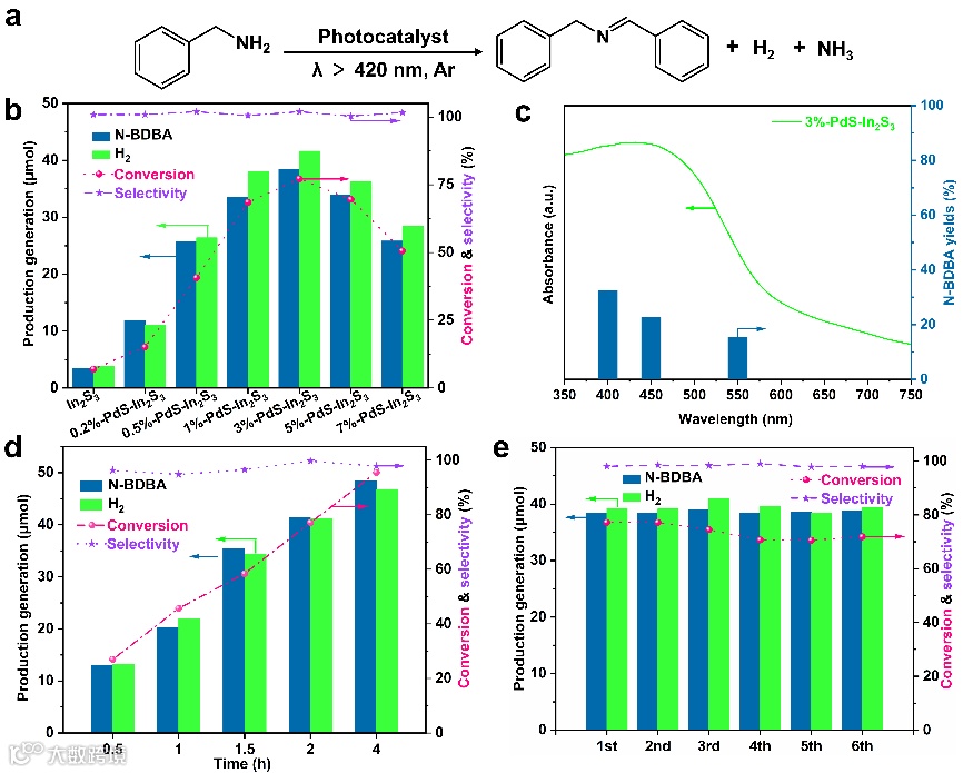 图 4. (a) 双功能苄胺脱氢偶联光催化反应化学方程式;(b) 光化学反应2 h后样品的光催化活性比较;(c) 3%-PdS-In2S3的DRS光谱以及在不同单色光下3%-PdS-In2S3的产物产率;(d) 对3%-PdS-In2S3的长期光活性试验;(e) 3%-PdS-In2S3的循环实验。
