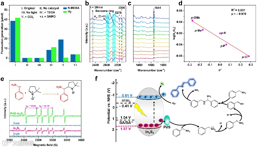 图 6. (a) 控制及猝灭实验;3%-PdS-In2S3的原位FTIR光谱(b)和(c);(d) 3%-PdS-In2S3的哈米特方程;(e) 空白In2S3和3%-PdS-In2S3在可见光照射或不照射下的EPR光谱;(f) PdS-In2S3上实现制氢和苄胺转化的反应机制。