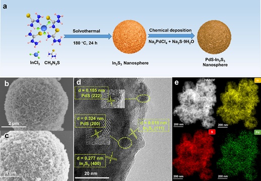 图 2. (a) 样品PdS-In2S3的合成示意图;(b) 空白In2S3和 (b) 3%-PdS-In2S3的SEM图;3%-PdS-In2S3的 (d) HRTEM图像和 (e) 高角环形暗场图以及相应的元素面扫图。