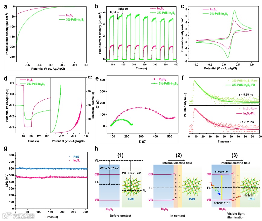 为了探究光催化活性增强的原因,我们进行了一系列电化学、光电化学和光致发光(PL)测试。测试结果表明:助催化剂PdS的表面修饰显著促进了In2S3主催化剂上光生载流子的分离,促使更多的光生载流子参与到氧化还原反应当中(图4 a-f)。此外,通过测定二者的接触电势差(CPD)(图4 g),确定了相应的能级位置,并提出了复合材料中内置电场(IEF)形成和载流子转移的机理(图4 h)。