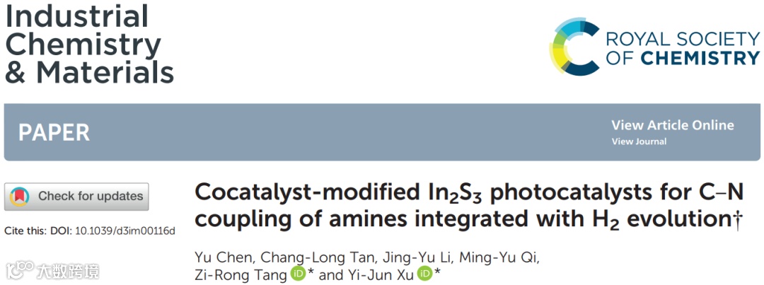 近日,福州大学徐艺军教授团队在期刊Industrial Chemistry & Materials上发表题为“Cocatalyst-modified In2S3photocatalysts for C–N coupling of amines integrated with H2 evolution”的研究论文。研究人员利用表面助催化剂改性工程构筑了PdS-In2S3复合微球光催化剂,作为空穴助催化剂的PdS有效促进了光生载流子的分离和迁移。PdS-In2S3表现出优异的光驱动催化选择性胺类偶联同时产氢的催化性能,并且对各种胺类的转化均具有良好的催化活性及选择性。