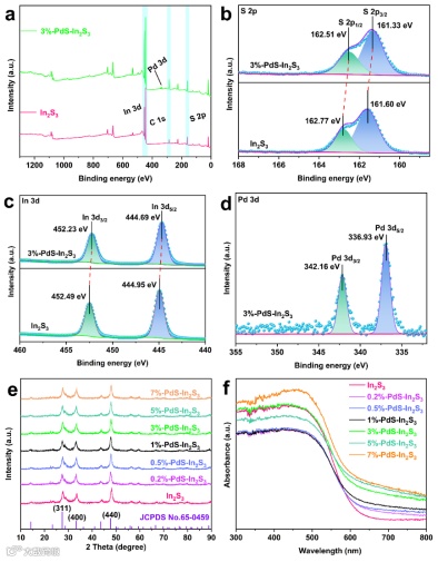 图 3. 空白In2S3与3%-PdS-In2S3的 (a) XPS光谱;空白In2S3与3%-PdS-In2S3的高分辨XPS光谱 (b) S 2p, (c) In 3d, 和 (d) Pd 3d;空白In2S3及含不同PdS量的PdS-In2S3样品的 (e) XRD 光谱与 (f) DRS光谱。
