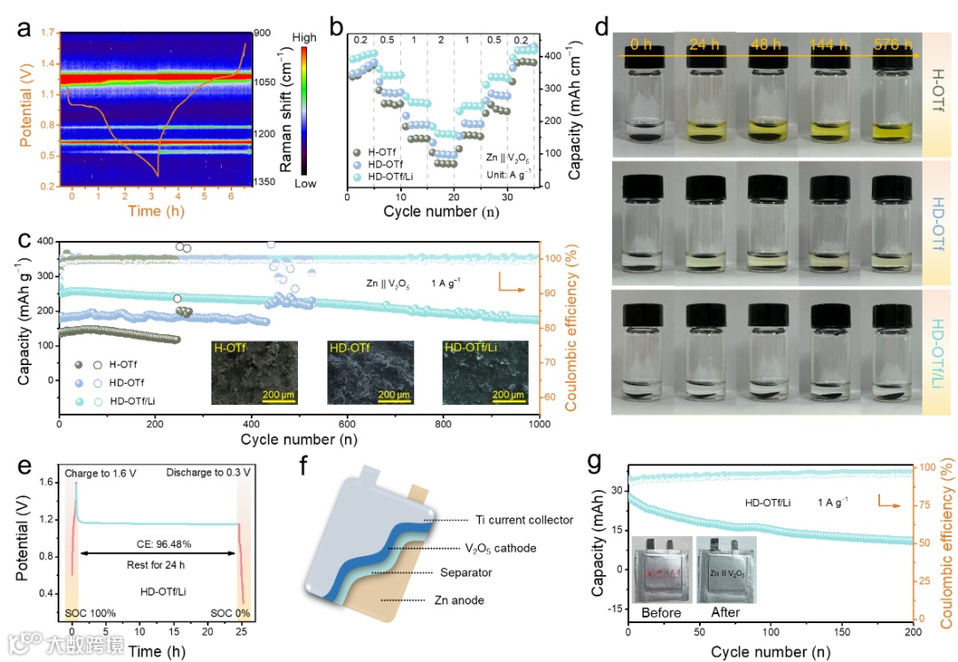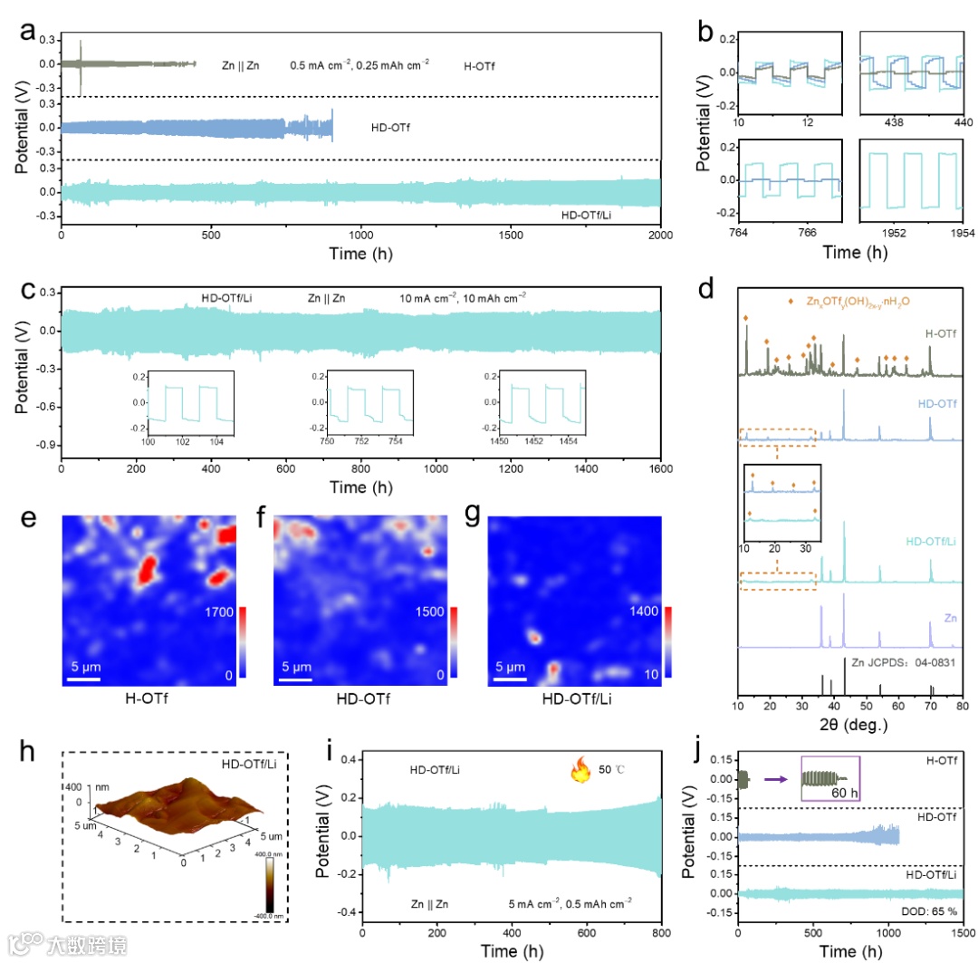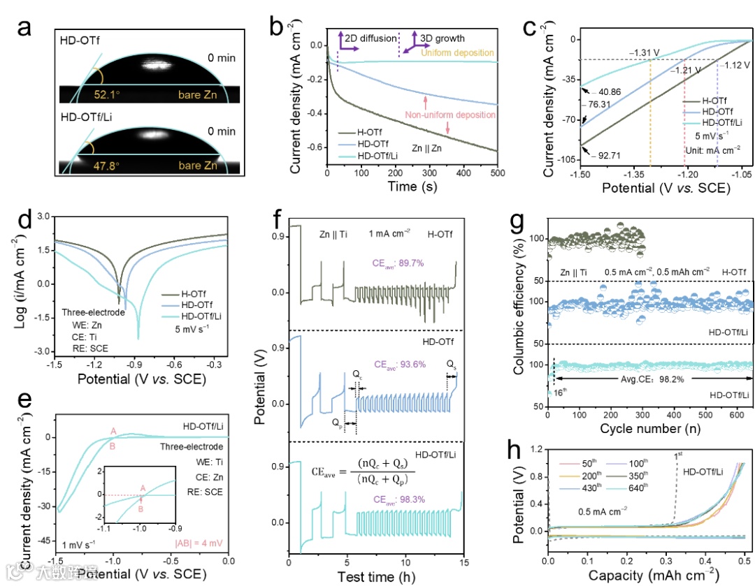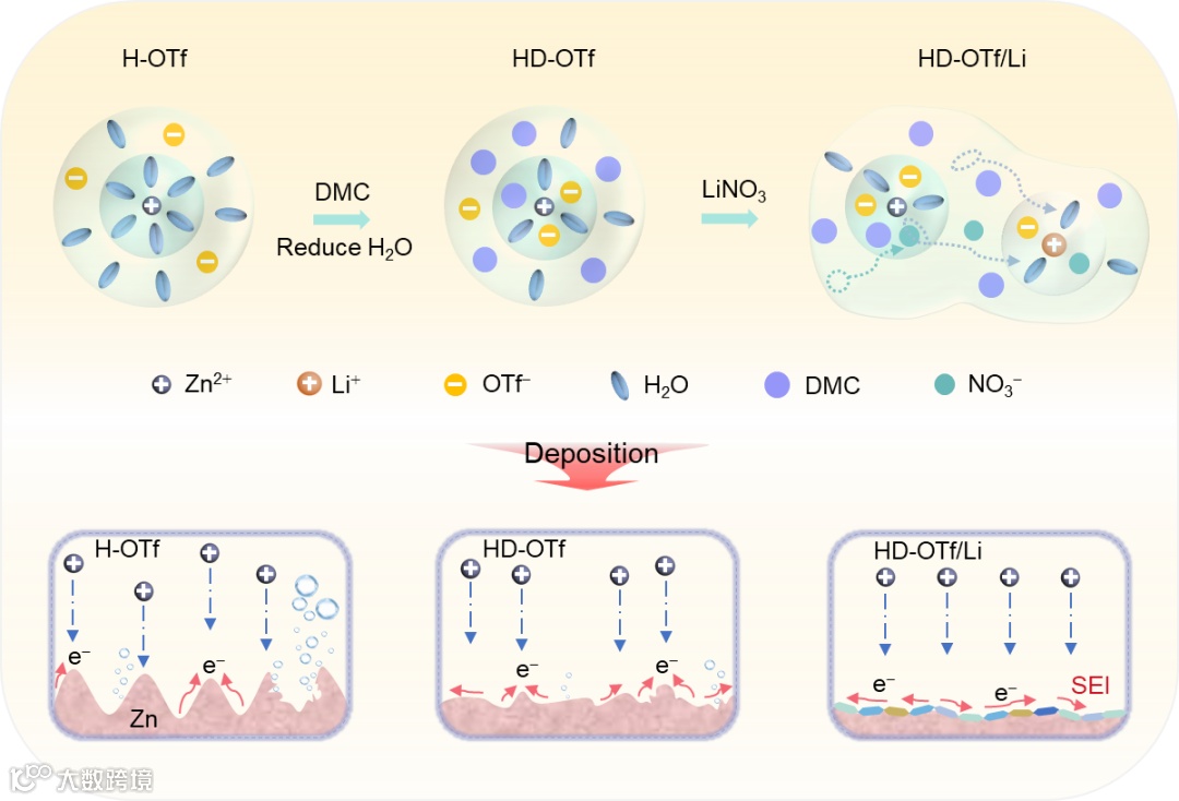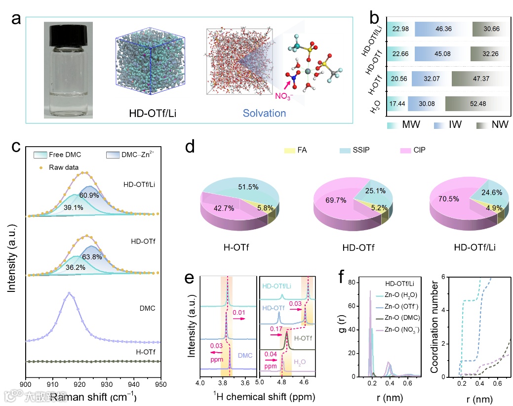 区别于传统的纯水系电解液,作者设计了一种有机混溶的水系电解液(HD-OTf/Li)体系。利用碳酸二甲酯(DMC)作为共溶剂,极大地减少了电解液体系中的水分子量,从根源上抑制锌枝晶生长以及伴随的析氢副反应。在此基础上,通过引入硝酸锂(LiNO3)添加剂实现竞争性溶剂化结构的构建,Li+通过与Zn2+竞争水分子,从而形成一种新的阳离子溶剂化结构,进一步减少了锌离子溶剂鞘层中的活性水分子,以及抑制锌腐蚀等副反应。