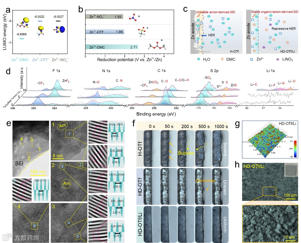 第一原理计算和表征结果联合表明,在HD-OTf/Li电解液体系中,DMC、NO3以及OTf阴离子会存在于锌离子的溶剂化鞘层中,且随着锌嵌入/脱出反应的进行,会在锌电极表面上衍生出一层致密的有机/无机富集SEI层,进一步抑制严重的锌枝晶生长和锌负极上的寄生反应。