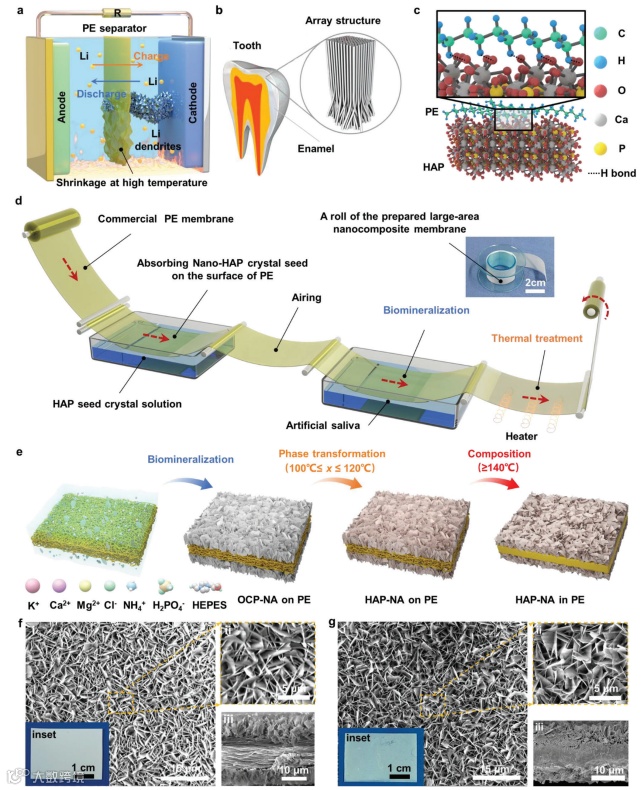 图1、受牙釉质启发的HAP-PE纳米复合材料电池隔膜设计思路、制备工艺及SEM微观形貌特征表征。