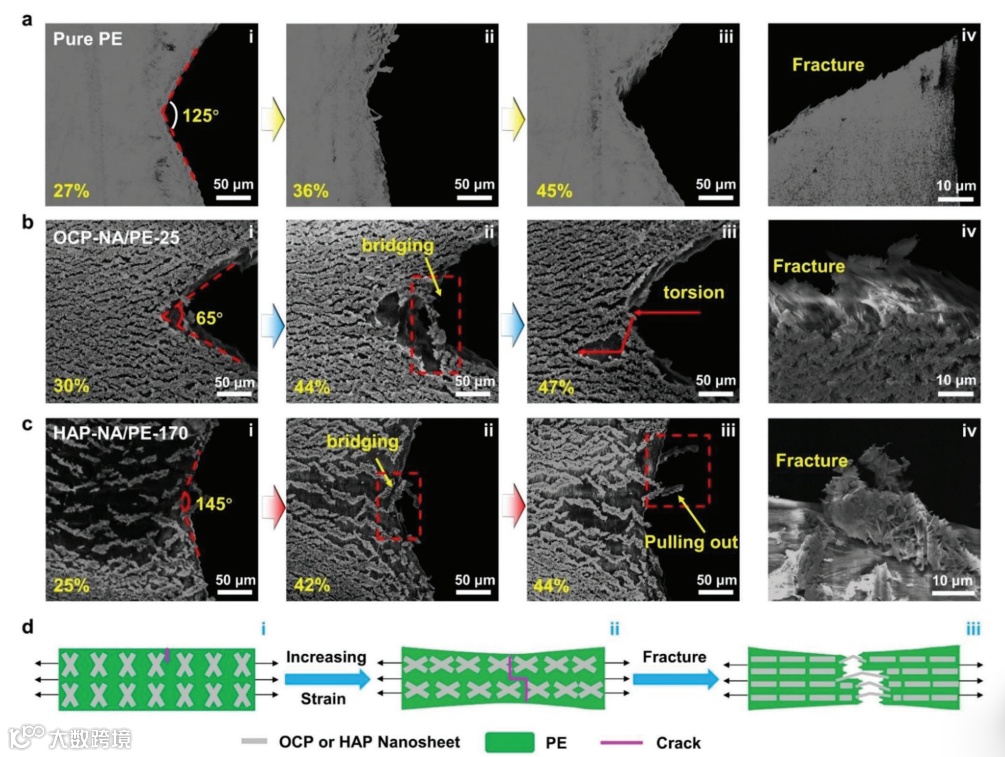 此外,采用微纳米平台所搭建的原位分析手段结合有限元模拟揭示了基于HAP与PE有机-无机互锁界面以及3D交织HAP阵列微纳结构界面相互协同的高效耗能增强机制(图2),HAP-PE有机无机杂化材料获得显著增强的机械性能及热尺寸稳定性。首先,交织的HAP纳米片阵列通过热处理后部分内嵌在PE基底内,形成增强的物理互锁有机-无机杂化界面,使得裂纹初始阶段更容易发生在HAP纳米片阵列和PE之间的界面上,因为当整个材料发生变形时,沿着界面裂纹处具有更高的能量消耗。其次,随着应变的增加,交织的HAP陶瓷纳米片阵列的结构会变形,甚至破裂,导致裂纹偏转和扭曲。最后,在断裂过程中,HAP纳米片碎片被拔出,桥接材料的断裂表面。同时,这种通过产生曲折和偏转的裂纹传播路径阻止材料进一步破坏,是天然材料和一些受生物启发的仿生结构材料最主要的外在增韧机制之一。