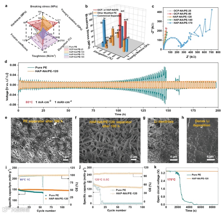 图 3. PE相关隔膜的机械性能比较及不同温度下的电化学性能表征。