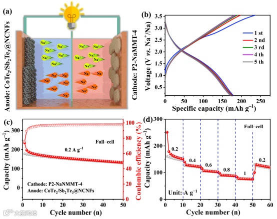 图6 (a) P2-NaNMMT//CoTe2/Sb2Te3@NCNFs钠离子电池示意图。(b) 全电池的充放电曲线和(c) 0.2 A g−1下全电池的循环性能。(d) 全电池的倍率性能。