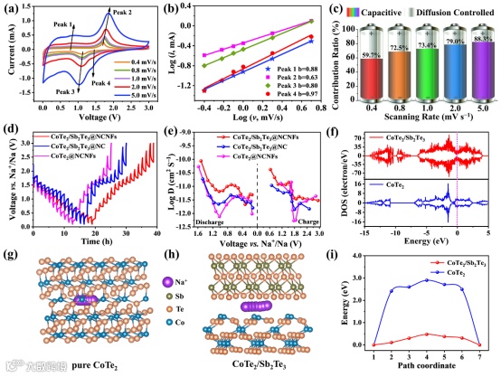 图4. (a) CoTe2/Sb2Te3@NCNFs在不同扫速下的CV曲线,(b) log (i)与log (v)之间的关系,(c) CoTe2/Sb2Te3@NCNFs电容控制贡献率。(d) CoTe2/Sb2Te3@NCNFs、CoTe2@NCNFs和CoTe2/Sb2Te3@NC电极的GITT电位分布和(e) Na + 扩散系数。DFT仿真计算分析,(f) 纯CoTe2和CoTe2/Sb2Te3的总态密度(DOS)。Na + 在(g) 纯CoTe2和(h) CoTe2/Sb2Te3异质结构中的迁移路径,以及(i) 相应的扩散能垒。
