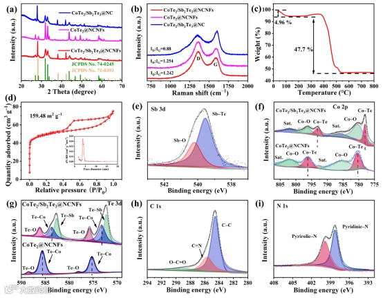 图2. (a) CoTe2/Sb2Te3@NCNFs、CoTe2@NCNFs和CoTe2/Sb2Te3@NC的XRD图谱和(b)拉曼光谱。CoTe2/Sb2Te3@NCNFs 的 (c) TG和 (d) 氮吸附-脱附等温线/孔径分布曲线。(e-i) CoTe2/Sb2Te3@NCNFs的(e) Sb 3d, CoTe2/Sb2Te3@NCNFs和CoTe2@NCNFs的(f) Co 2p 和(g) Te 3d, CoTe2/Sb2Te3@NCNFs的(h) C 1s和(i) N 1s的高分辨率XPS光谱。