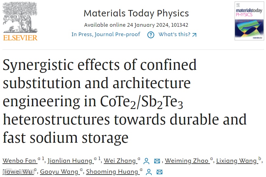 近日,广东工业大学黄少铭教授团队在《Materials Today Physics》期刊上发表题为“Synergistic Effects of Confined Substitution and Architecture Engineering in CoTe2/Sb2Te3 Heterostructures Towards Durable and Fast Sodium Storage”的文章。在此,我们提出了一种分层多孔结构,通过结合静电纺丝和原位离子取代来解决如今钠离子电池负极面临的挑战,其中超细CoTe2/Sb2Te3异质结颗粒被双碳层(CoTe2/Sb2Te3@NCNFs)所限制。具体来说,多孔纳米纤维网络增强了电解质的渗透,并构成了电子传输的高速公路。有趣的是,高容量的Sb通过原位离子取代反应取代了部分Co,不仅获得了更多的孔隙以减轻循环过程中的体积应力和颗粒团聚,而且通过构建异质结构提高了可逆容量。令人印象深刻的是,CoTe2/Sb2Te3@NCNFs负极在0.2 A g−1下循环500次后具有301.77 mAh g−1的优异比容量,在5.0 A g−1下具有144.52 mAh g−1的优异倍率性能。系统的原位测试揭示了高可逆的“转换-合金”储存机制和“电池-电容器双模式”反应过程。最后,组装了一个钠离子全电池(P2-NaNMMT//CoTe2/Sb2Te3@NCNFs),并获得了优异的循环性能和倍率能力。这种独特的纳米结构设计方法为钠离子电池的先进电极材料的设计提供了新的见解。