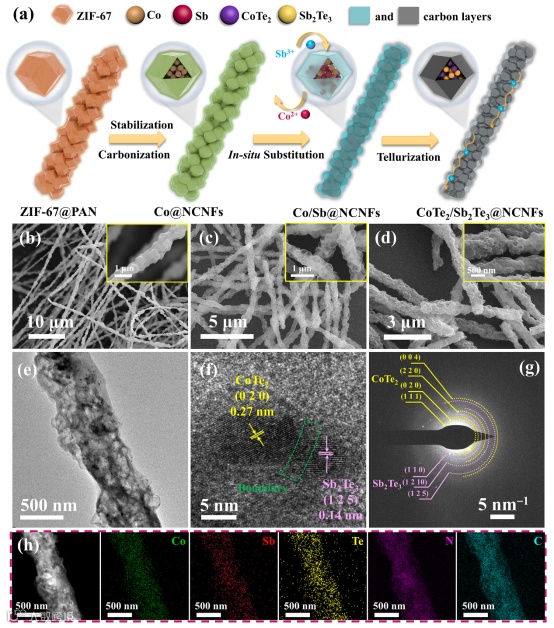 图1. (a) CoTe2/Sb2Te3@NCNFs合成过程示意图。(b) ZIF-67@PAN前驱体和(c) Co@NCNFs纤维的SEM图像。CoTe2/Sb2Te3@NCNFs 的(d) SEM, (e) TEM, (f) HRTEM,(g) SAED,(h) 元素映射图像。