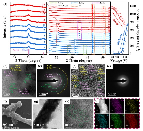 图5. (a) 第一圈循环中CoTe2/Sb2Te3@NCNFs电极的非原位XRD图。(b) 和(c) 为放电至0.01 V时CoTe2/Sb2Te3@NCNFs的HRTEM图像和相应的SAED图像, (d) 和(e) 为充电至3.0 V时CoTe2/Sb2Te3@NCNFs的HRTEM图像和相应的SAED图像。CoTe2/Sb2Te3@NCNFs电极在1.0 A g−1下300次循环后的(f) SEM, (g) TEM, (h) HRTEM和(i) 元素映射图。